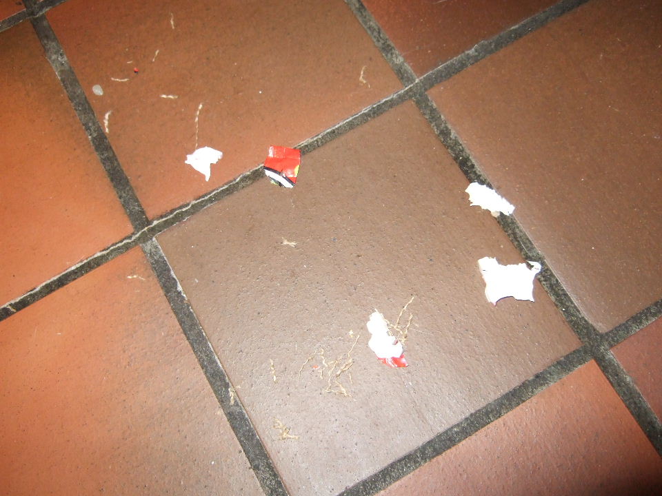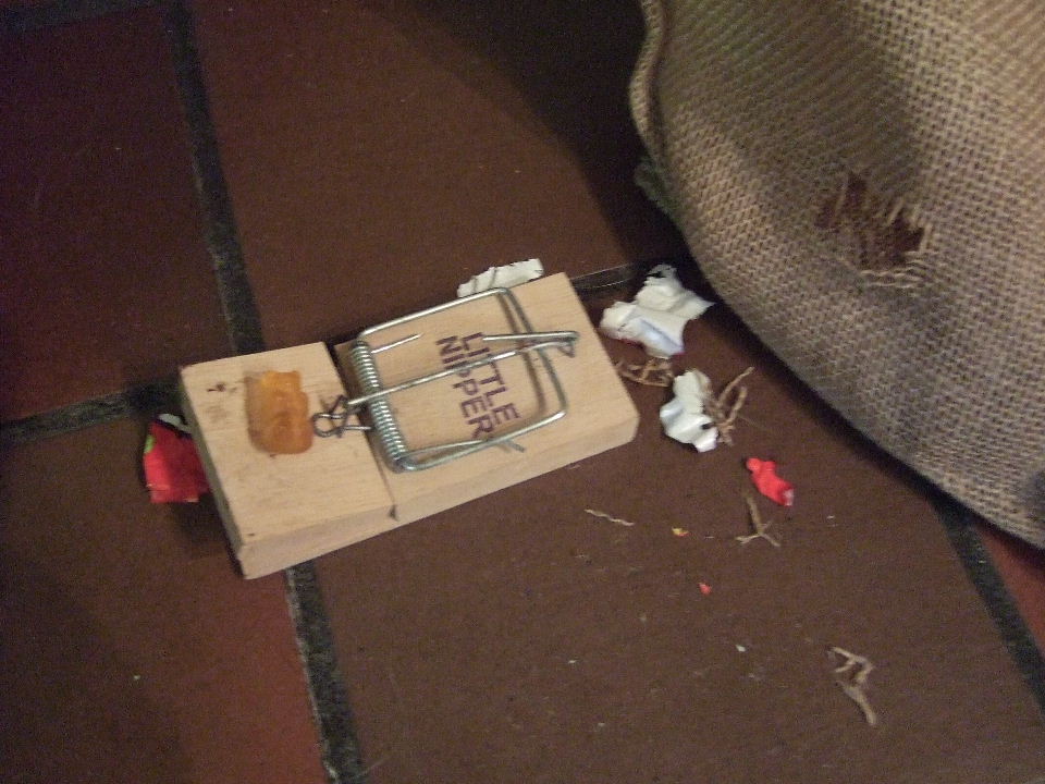 Dave had left his food bag on the kitchen floor overnight. A mouse (or rat?!) chewed through and took 3 packs of wine gums!