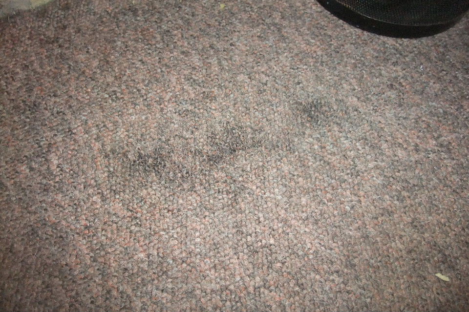 In an effort to get the fire lit, Steve nearly burns down the cottage by dropping a lit paper and burning the carpet. His clean-up efforts resulted in it looking like this