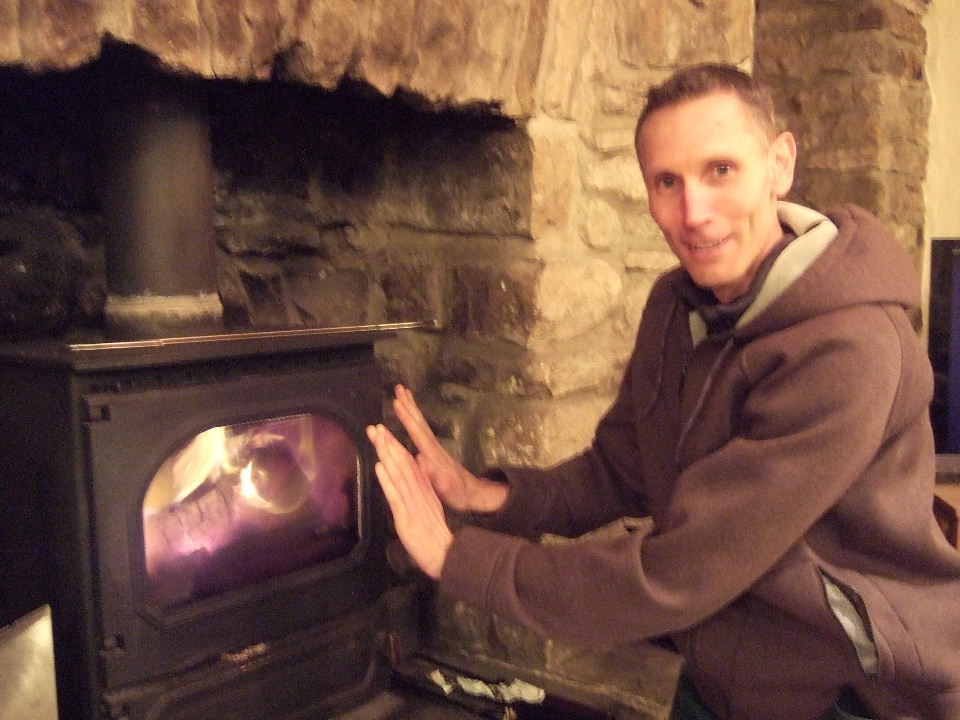 Back home Steve enjoys the warmth provided by the fire he so painstakingly persevered in getting going earlier