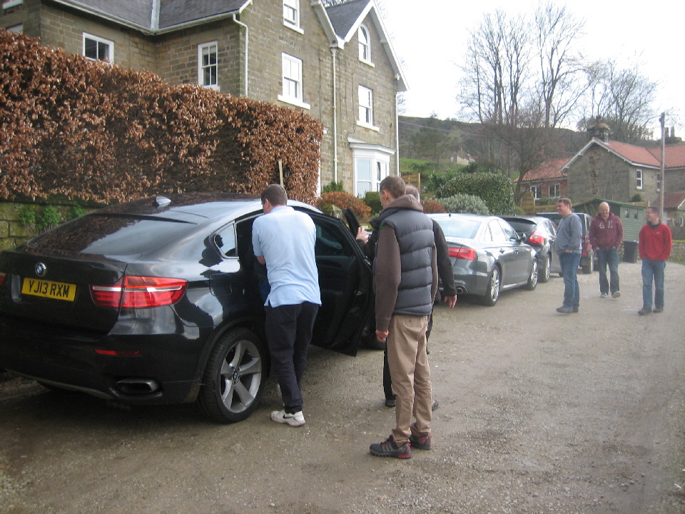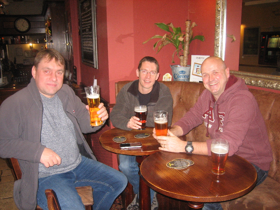 Simon, Charlie and Tim stop in Pickering to place Grand National bets. There's a nice 1958 MG A in the car park. They meet up with John for a pint.