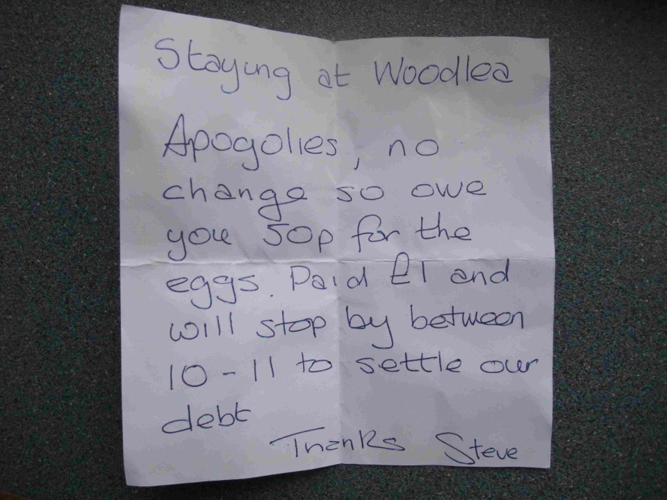 Steve replaces his IOU with cash for the eggs (£1.50 per dozen)