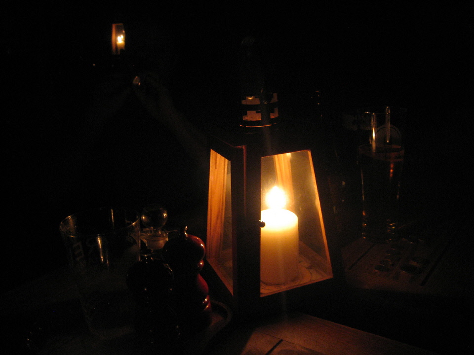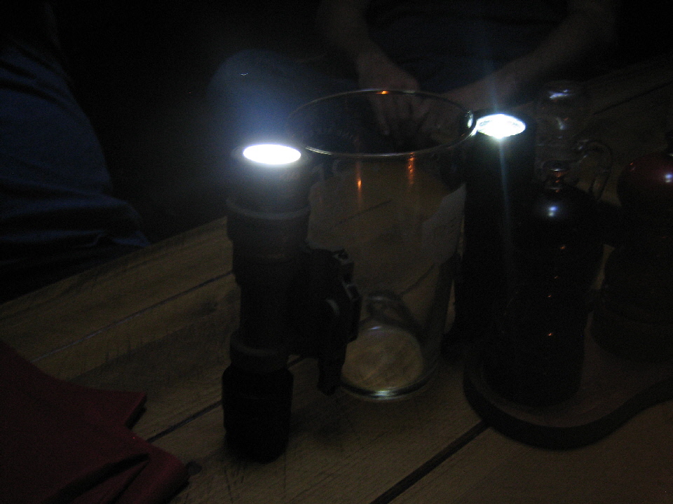 So we head back to The Red Lion and have another good meal and some beers ... then all-of-sudden, the power goes; music stops; lights go out. A few moments of darkness before the emergency lighting kicks in. We improvise with our own torches until the staff bring round candle-lanterns. We hear that the telegraph pole outside is on fire - so John "Fireman" Astbury decides he better see if he can help - and gets outside just in time to stop the landlady spraying a water fire extinguisher on the electricity box that's on fire up the pole! The fire brigade turn up and so does the Welsh Electricty Board - who are overheard saying that the box was on the list to be checked out. Too late. In the meantime we have some difficulty getting more drinks - we have to have bottled beer and only if we've got the right money!