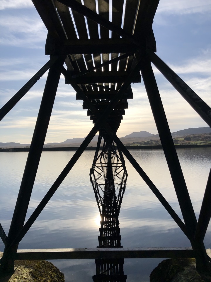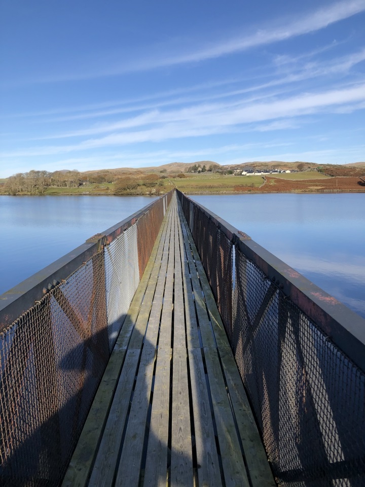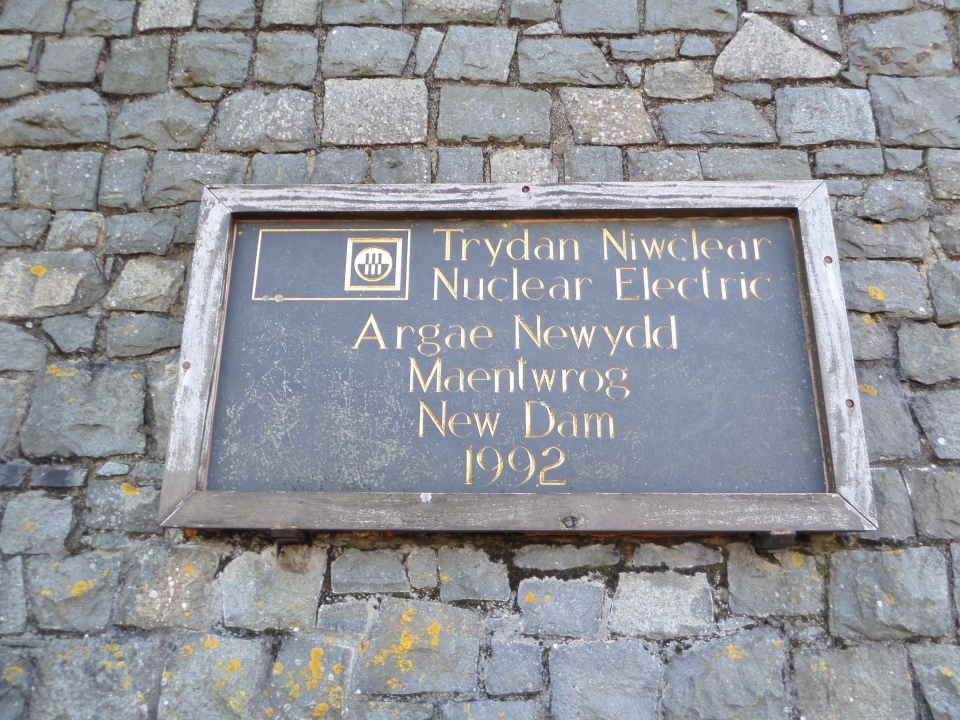 "When the reservoir was created, around twenty properties were flooded and public rights of way across the land were lost. To compensate for the latter, a public footbridge was built across the southern end of the lake. The steel bridge comprises 20 lattice-girder spans supported by trestle towers, is a quarter of a mile long, and links Trawsfynydd village with the site of a former local chapel."