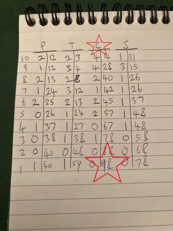 Upon our return we finish that game of Botheration, in which, unusually and much to his delight, Charlie executes a dominating victory, correctly guessing his trick count in 8 out of the 10 rounds!