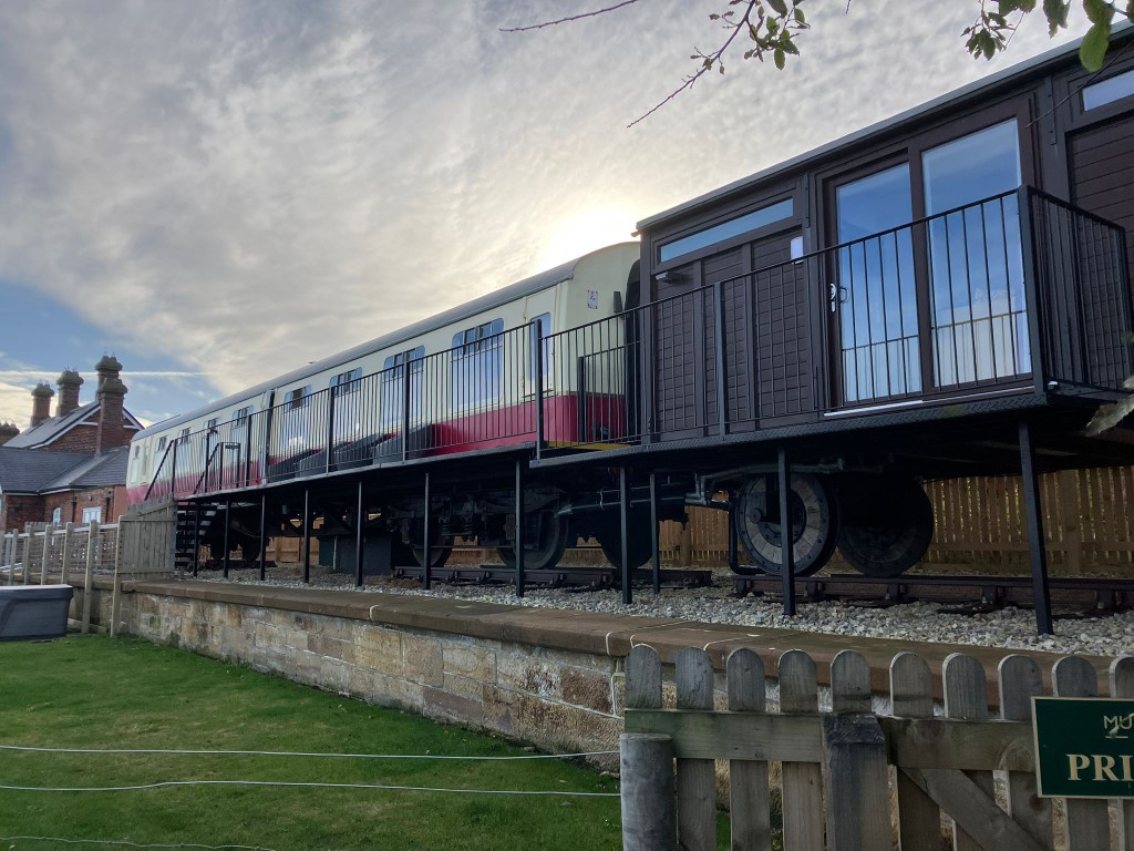 Train coaches converted into living spaces.
